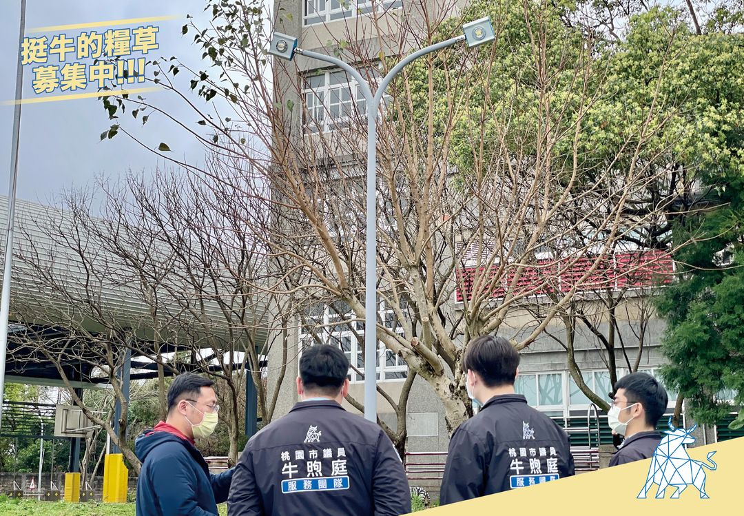 當選後,我們拜訪大湖國小張美珍校長溝通想法,很高興地發現,其實學校一直秉持著與周遭社區為善的精神,樂於開放校園:除了操場有後門設計之外,甚至還提供籃球等球具,歡迎鄉親假日使用。因此我相信,在大湖國小投資夜間照明設備,必定會收穫很好的效果,在議會更加積極爭取,並成功讓教育局將第一筆「點亮校園」試辦經費投入龜山。