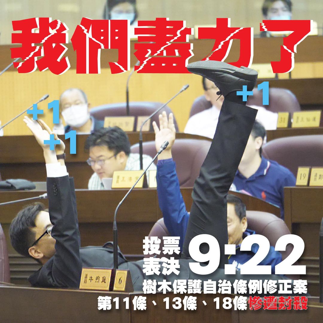 雖然,修法結果雖然不盡人意,私有老樹列管的進度怕是要繼續裹足不前。然而,我們卻成功地衝擊桃園市議會在地方自治條例上「唯市府是從」慣例,為桃園市議會「奪回立法權」鳴響了第一槍。